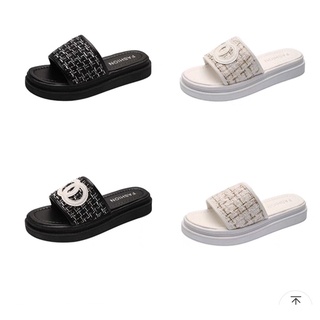 Dép nữ quai ngang đính tag Chanal phủ kim tuyến, đế bánh mỳ, đúc nguyên khối cao 3cm - 1000029