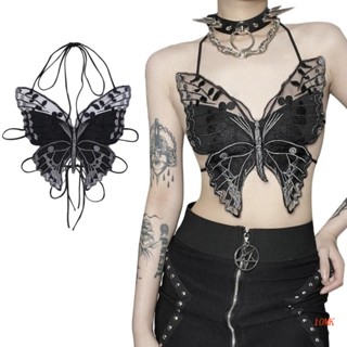 Áo Croptop Hai Dây Cổ Chữ V Màu Đen Phối Ren Hình Bướm Phong Cách Gothic Punk Quyến Rũ Cho Nữ