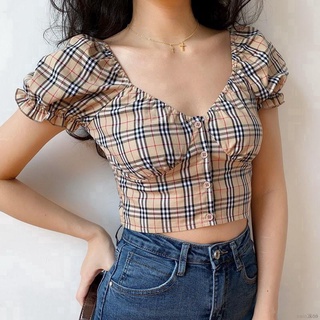 Áo Croptop Tay Ngắn Họa Tiết Sọc Caro Thời Trang Cho Nữ