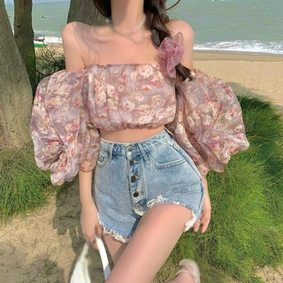 Áo Crop top chiffon Tay Ngắn Trễ Vai In Họa Tiết Hoa Thời Trang Hàn Quốc Dành Cho Nữ