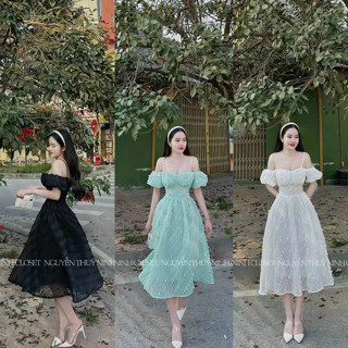 Đầm váy nữ trễ vai midi, đầm dự tiệc thiết kế dáng xoè 3 màu Đen, Trắng, Xanh cho nàng đi chơi, đi dạo đều xinh