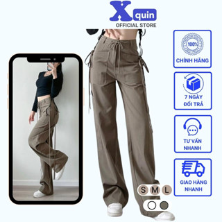 Quần jean kaki túi hộp cạp cao dáng dài ống rộng Xquin, Quần kaki lưng cao rút dây dáng rộng thời trang Hàn Quốc
