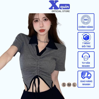 Áo croptop nữ ngắn tay cổ bẻ phối rút dây Xquin, Áo kiểu nữ ôm body phối viền khoét eo cực tôn dáng