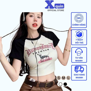Áo croptop nữ ngắn ta cổ tròn tay phối màu in hình Xquin, Áo kiểu nữ ôm body chất thun cotton dày dặn