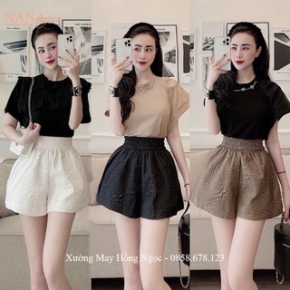 Quần đùi phồng nữ vải xốp dập in nổi hoa 3D cạp chun kiểu quần đùi xốp nữ ống rộng màu Trắng Đen mặc ở nhà biển hẹn hò