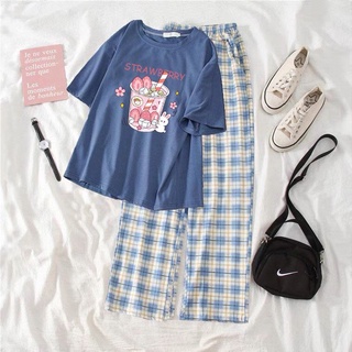 Sét Áo Nước dâu + quần kẻ xanh, Áo thun from rộng, Chất đẹp không xù, quần suông ống rộng, Sét bộ mặc ở nhà - MODY