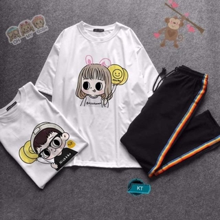 Sét áo phông Cô bé thỏ + quần suông trơn, Áo thun from rộng, Chất đẹp không xù, quần suông ống rộng - MODY