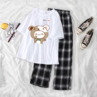 Sét Áo phông Gấu crush+quần karo, Áo thun from rộng, Chất đẹp không xù, quần suông ống rộng, Sét bộ mặc ở nhà - MODY