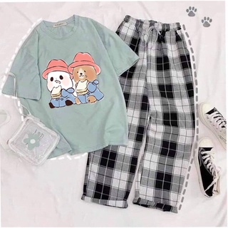 Sét Áo Gấu nhỏ + quần kẻ karo xanh, Áo thun from rộng, Chất đẹp không xù, quần suông ống rộng, Sét bộ mặc ở nhà - MODY