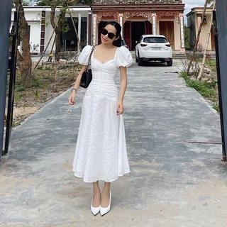 Đầm trắng đuôi cá dáng ôm ngực tay bồng vải thô boi mềm 143