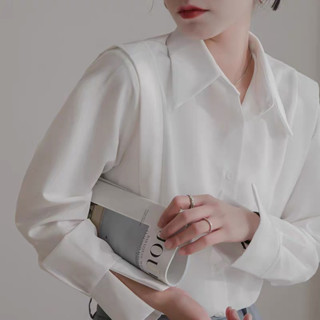 Áo sơ mi cổ V khoét sau dáng dài tay trắng - áo sơ mi kiểu 123