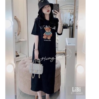Đầm suông nữ, váy suông nữ cộc tay mùa hè in chú gấu giữa ngực cá tính