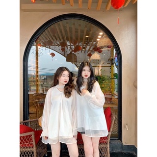 Áo sơ mi nữ dài tay phồng form rộng màu trắng đơn giản basic