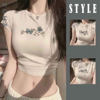 Áo Baby Tee Thun Croptop Nữ Ngắn Tay Ôm Dáng Hở Rốn In Họa Tiết Bướm Phong Cách Mùa Hè Mới Cho