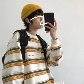 Áo Sweater tay dài dáng rộng họa tiết kẻ sọc phong cách vintage Hàn Quốc thời trang cho nam