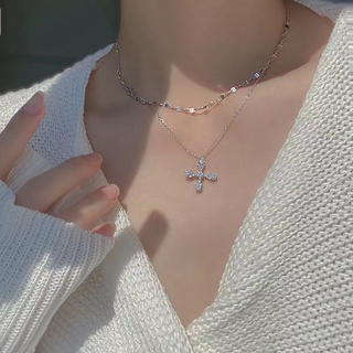 Vòng cổ Màu Bạc Hai Lớp Hình Chữ Thập Đính Kim Cương Cao Cấp Thời Trang Cho Nữ