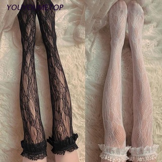 Tất lưới dài qua gối viền bèo nhún in họa tiết ren hoa phong cách Lolita Nhật Bản