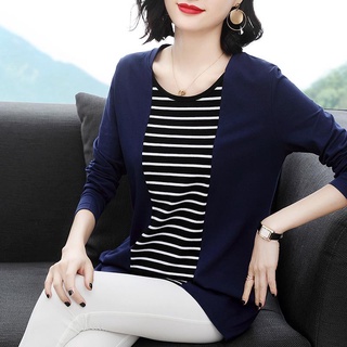 Áo thun tay dài dáng rộng họa tiết kẻ sọc thời trang cho phụ nữ trung niên