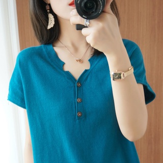 Áo dệt kim ngắn tay dáng rộng cổ chữ v thời trang mùa hè cho phụ nữ trung niên