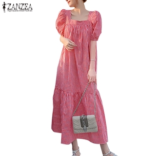 Đầm ZANZEA maxi tay ngắn cổ vuông phồng in sọc caro cho nữ