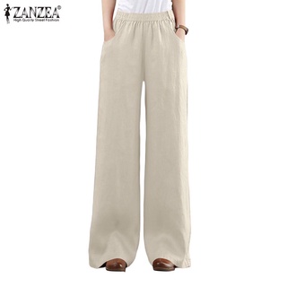 Quần ZANZEA cotton eo co giãn màu trơn ống rộng thời trang đơn giản thanh lịch cho nữ