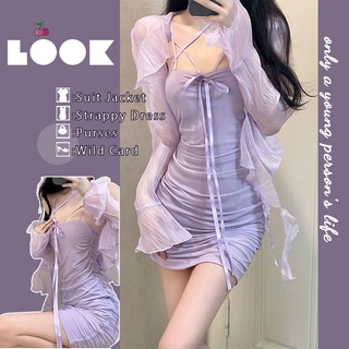 Set Áo Cardigan Bèo Nhún Màu Trơn + Đầm Hai Dây Ôm Hông Gợi Cảm Phong Cách Mùa Hè Mới 2022 Cho Nữ