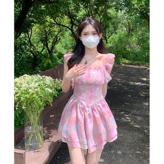 Đầm Hai Dây Mùa Hè Dáng Vừa Vặn Eo Cao Màu Hồng Và Xanh Dương Mát Mẻ Phong Cách Pháp