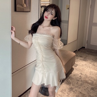 Bắn thật sự◆Đầm Ngắn Trễ Vai Ôm Dáng Phối Lưới Phong Cách Thời Trang Mới 2022