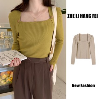 Áo sweater ZHELIHANGFEI tay dài cổ vuông hở xương quai xanh phong cách sang trọng dễ phối đồ