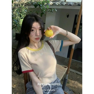 ZHELIHANGFEI Áo Thun Cotton Tay Ngắn Hở Vai Màu Sắc Tương Phản Thời Trang Dành Cho Nữ