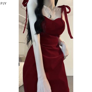 Pjy Đầm Mini Hai Dây Hở Lưng Màu Đỏ Phong Cách Vintage Hàn Quốc Thanh Lịch Giản Dị Dành Cho Bạn Nữ PJ