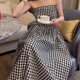 Pjy Đầm Dài Dáng Chữ A Dài Xếp Ly Sọc Ca Rô Màu Tương Phản Cổ Điển Không Dây Cho Nữ 2023 PJ