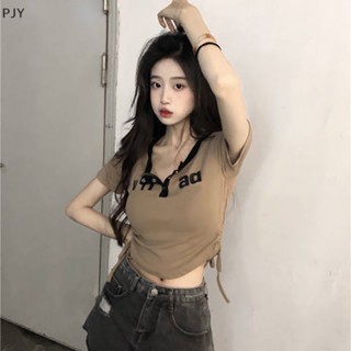 Áo Thun Ngắn Tay Cổ Tròn In Chữ Rút Dây Phong Cách Retro Mỹ Cho Nữ PJ