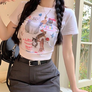 Áo Thun Crop Top Tay Ngắn Cổ Tròn In Hình Mèo Dễ Thương Phong Cách Retro Mỹ Thời Trang Mùa Hè Cho Nữ PJ