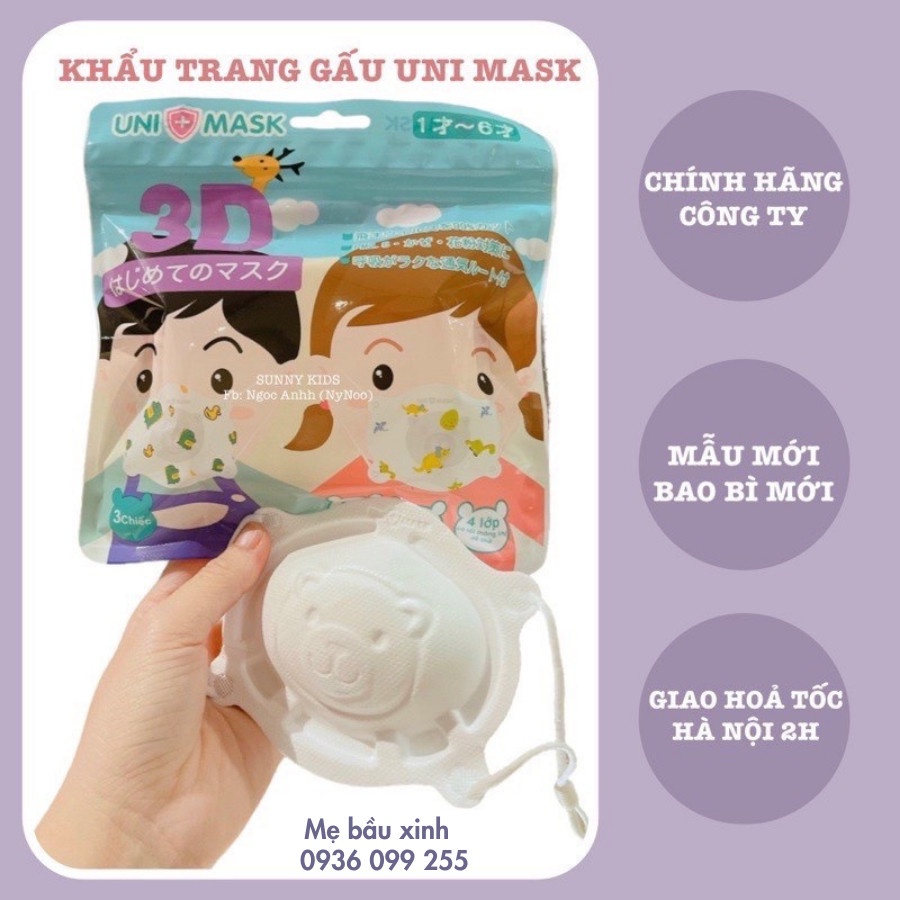 1. Tên sản phẩm: Set 3 Khẩu trang hình gấu 3D cho bé từ 0-3 tuổi thương hiệu Unimask cao cấp xuất Nhật, dây có nút điều chỉnh 2. Thông tin sản phẩm: - Chi tiết nổi bật của khẩu trang gấu trẻ em hiệu BEAN UNIMASK * Có nút tai mềm điều chỉnh tùy ý cho khẩu trang vừa vặn với khuôn mặt bé để ngăn chặn tối đa bụi và vi khuẩn gây hại * Kích thước sản phẩm: 9 x 8 x 3 cm * Sản phẩm từ bông hoạt tính đã được khử trùng nghiêm ngặt giúp chống bụi và lây nhiễm nguồn bệnh. * Vải không dệt với các lớp tích điện âm bám trên bề mặt khẩu trang dễ dàng hút những phân tử bụi có đường kính rất nhỏ giúp ngăn không cho bụi bám vào mũi và đi vào con đường hô hấp bé. * Đây là khẩu trang thiết kế dùng 1 lần, nhưng nếu tiết kiệm các mẹ có thể giặt qua và tái sử dụng.
