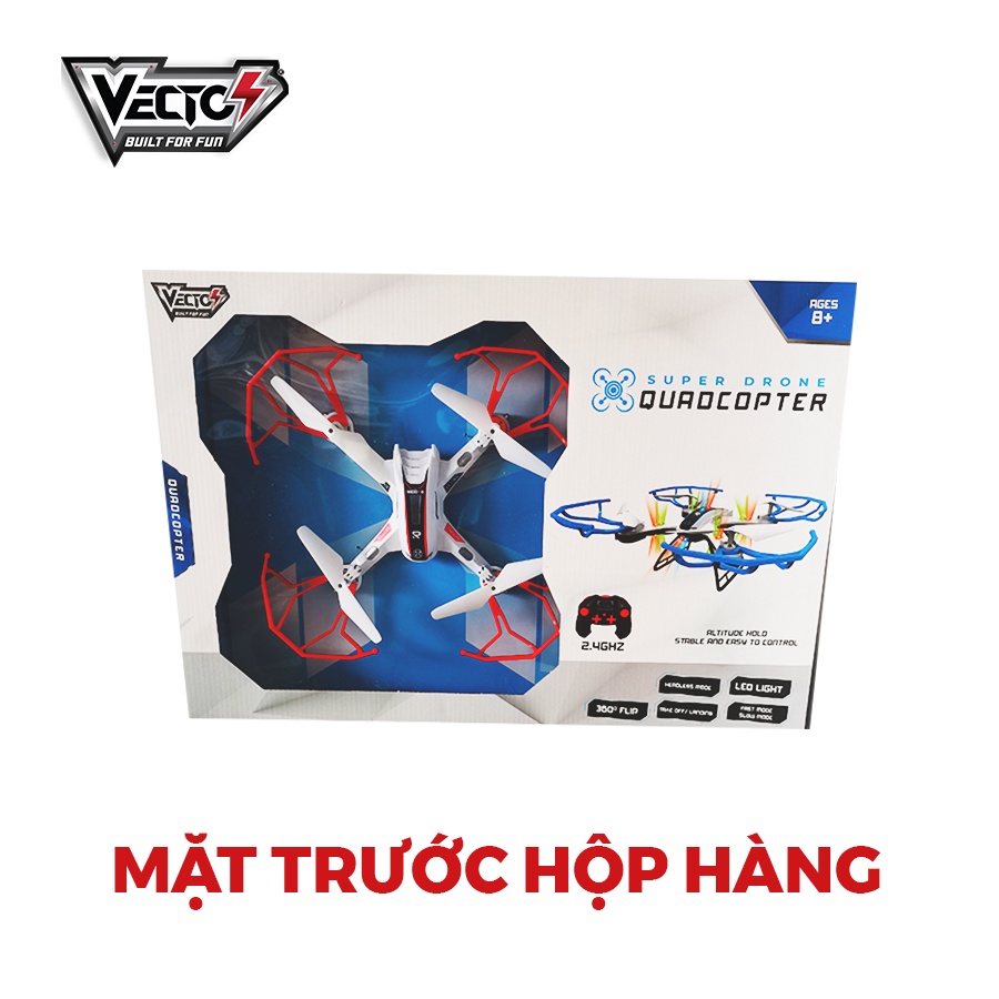 Drone Quadcopter (Drone 4 cánh) từ VECTO – Món đồ chơi bay siêu hay và mới lạ dành cho bé, với các chức năng nổi bật để bé chơi thật vui: + Trình diễn nhào lộn 360 độ độc đáo + Chức năng Headless Mode tối tân (*) + Khả năng tự giữ độ cao tân tiến (**) + Trang bị hệ thống đèn LED sống động + Điều khiển Drone Quadcopter lên – xuống, tiến-lùi, rẽ trái-rẽ phải + Có thể điều chỉnh chế độ nhanh/chậm (*) Chức năng: Headless mode là một chế độ điều khiển mà mặt drone hướng vào remote sẽ được mặc định là phần đuôi của drone (**) Chức năng tự giữ độ cao: ngay cả khi bạn không điều khiển thì đồ chơi bay vẫn có thể giữ vững một độ cao nhất định trên không trung.