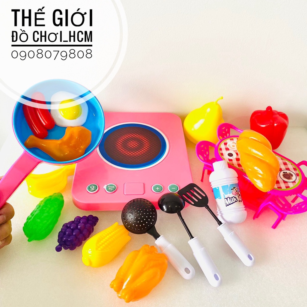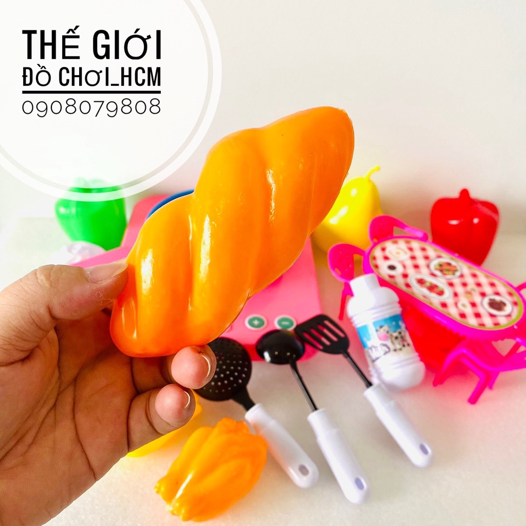 - Sản phẩm dồ chơi là túi bếp từ gồm nhiều loại trái cây, hoa quả, đồ dùng nhà bếp, trứng ốp la, bàn ăn, xúc xích, chảo, giá chiên đồ ăn...y hình! - Có khoảng 30 chi tiết, loại lớn nên bé nhỏ dễ chơi, không sợ bé nuốt ạ! - Chất liệu: Nhựa. - Kích thước túi khoảng 35x25x15cm. - Hình/clip do Shop tự chụp/quay 100%.
