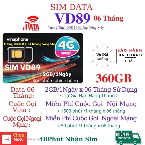Sản phẩm Mô tả loại Sim VD89: 1️⃣ Loại 1 : Sim Data VD89 : Gói 06 -12 Tháng : • Miễn Phí 2GB DATA 4G Tốc Độ Cao / 1 Ngày x gói 06 Tháng và 12 Tháng Tổng Data có 360GB 6 Tháng và 720GB 12 Tháng • Miễn phí 1000 phút gọi nội mạng vina /1 tháng x gói 06 Tháng và 12 Tháng • Miễn phí 50 phút gọi ngoại mạng /1 tháng x gói 06 Tháng và 12 Tháng • Sim Tự gia hạn hàng tháng 👉 Cú pháp kiểm tra soạn : • Soạn : data gửi 888 • Gọi : 18001091 ấn nhánh 1 hỏi chu kỳ gói cước .