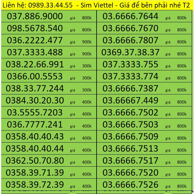 Lưu ý khi đặt đơn: Do ứng với mỗi sim là mỗi giá khác nhau, nên quý khách lưu ý: Giá cơ bản là 100k, Do sim Viettel có nhiều giá nên, nên: Nếu Quý khách chọn số giá 300k, quý khách vui lòng đặt đơn với số lượng là 3. Nếu Quý khách chọn số giá 900k, quý khách vui lòng đặt đơn với số lượng là 9. Nếu Quý khách chọn số giá 2 triệu, quý khách vui lòng đặt đơn với số lượng là 20. Cứ tương như vậy ạ.