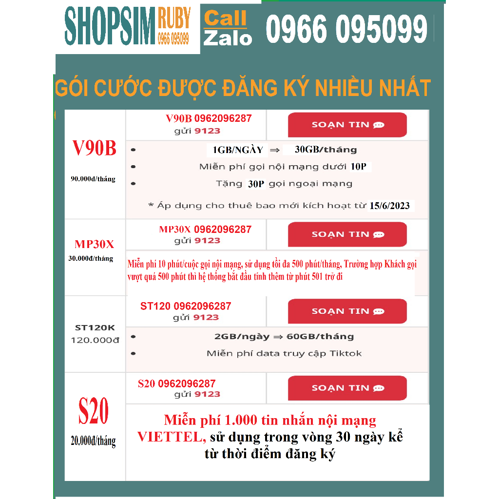 A. Sim Shop giao tất cả là Sim Viettel Chính hảng,Trả trước , Tài khoản sau khi mua là 0đ với tiện ích như sau: - Sim Gói cước Tomato,Nghe gọi mãi mãi không cầnphải nạp tiền hàng tháng, Khách lưu ý là Trong vòng 60 ngày Quý Khách có gọi dùm Shop 01 cuộc gọi đi bất kỳ thì hạn sử dụng sẽ tăng liên tục. - Sim Viettel trả trướcdùng để nghe gọi 02 chiều, Khách sử dụng bao nhiêu thì nạp tiền bấy nhiêu. B.- Ngoài ra Khách hàng có nhu cầu sử dụng 4G, gọi nhiều thì đăng ký sửdụng thêm các gói cước hấp dẫn phù hợp với nhu cầu của Khách, Shop mô tả và giới thiệu những gói cước áp dụng cho những sim Shop Bán. - Sử dụng ngắn hạng vài ngày. + Chỉ cần 4G thì có gói ST15 (15.000đ/3 ngày, có ngay 3Gb lưu lượng tốc độ cao sử dụng trong 03 ngày). +Nhắn tin nội mạng viettel thì có gói S5 (5.000đ/7 ngày, miễn phí 500 tin nhắn nội mạng). + Gọi Nội mạng viettel thì có gói MP5X (5.000đ/ngày, có 50 phút gọi nội mạng sử dụng đến 24h hàng ngày). - Chỉ có nhu cầu gọi nội mạng tính theo tháng, có gói MP30X (30.000đ/tháng, miễn phí 10 phút/cuộc gọi nội mạng, sử dụng tối đa miễn phí 500 phút/tháng). - Chỉ có nhu cầu sử dụng 4G tính theo tháng, có gói SD70 (70.000đ/30 ngày, miễn phí 1Gb/ngày, tháng có 30Gb). - Có nhu cầu sử dụng Gọi nội mạng, ngoại mạng và 4G có gói V90B (Miễn phí 10 Phút/Các cuộc gọi nội mạng-Miễn phí 30 phút gọi ngoại mạng/Tháng - Miễn phí 1GB/Ngày dùng toàn quốc – Phí đăng ký tháng đầu: 90.000đ/Tháng, Qua tháng sau hệ thống tự động gia hạn. • Sim Viettel Shop bán cho Khách có hơn 100 gói cước cho Khách hàng tham khảo, để biết nhiều gói cước khác thì Khách làm như sau: Sau khi khách đăng ký chính chủ và kích hoạt sử dụng, Khách tải My Viettel về máy điện thoại, Khách đăng nhập số điện thoại mới mua vào My Viettel, thì khách sẽ thấy sim Khách mua có rất nhiều gói cước được mô tả trong My Viettel, Khách thấy nhu cầu mình sử dụng phù hợp với gói nào thì Khách sẽ đăng ký gói đó. HỖTRỢ / HƯỚNG DẪN -Sim4G có hỗ trợ cả máy 3G- Bảo Hành 12 tháng trên hệ thống toàn quốc - Sim 3 in 1Thích hợp với các dòngđiện thoại, Ipad , Thiết bị phát Wifi, Dcom (Sim thường,Mirco, nano)....