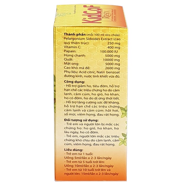 Thành phần của KidcoF Sản phẩm KidcoF bao gồm những thành phần chính như: Pelargonium Sidoides Extract (Cao Quỳ Thiên Trúc): 250mg Vitamin C: 400mg Papain: 100.000 IU Húng Chanh: 5000 Mg Quất: 10.000 Mg Mật Ong: 5.000 Mg Cao Khô Mã Đề: 2.600 Mg Phụ liệu : Acid citric, Natri benzoat, đường kính, nước tinh khiết vừa đủ.