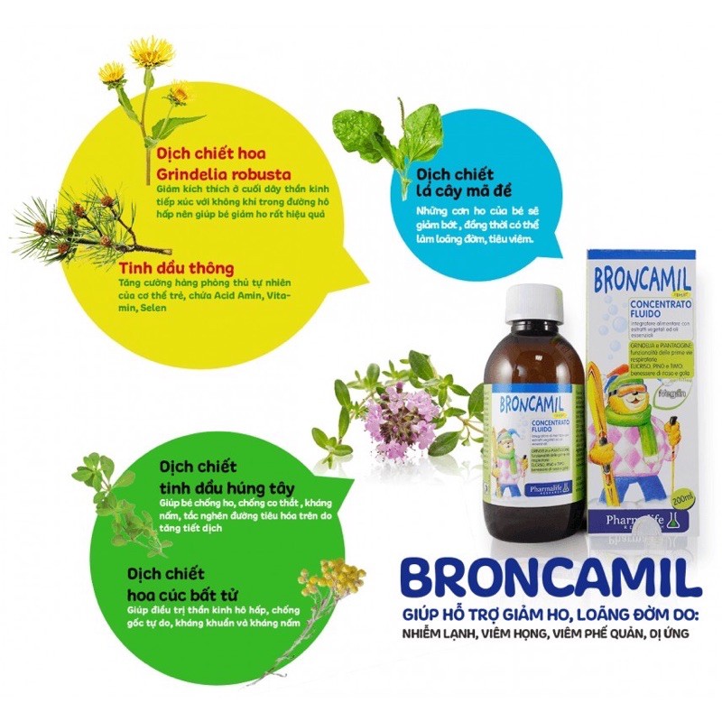 Broncamil bimbi là siro ho thảo dược chiết xuất tiêu chuẩn hóa từ các loại thảo dược hữu cơ đã qua chọn lọc và kiểm soát sinh học chặt chẽ với các tiêu chuẩn nghiêm ngặt tại châu Âu nên rất phù hợp với những đối tượng yêu cầu chế phẩm có độ an toàn cao như trẻ nhỏ. Sản phẩm là siro ho cao cấp 3 trong 1 với 100% thảo dược chuẩn hóa, được nhập khẩu nguyên hộp từ Italia, giúp trị ho, làm dịu họng, pha loãng đờm nhầy, làm sạch đường hô hấp và nâng cao sức khỏe mũi, họng cho bé, bảo vệ cơ thể luôn khỏe mạnh. Có hiệu quả vượt trội. Sau 3 ngày sử dụng sẽ giảm ho – dịu họng – loãng đờm – thông thoáng đường hô hấp. Sau 1 liệu trình sẽ giúp trẻ tăng miễn dịch hô hấp, hạn chế ho tái phát trở lại. 100% thảo dược tiêu chuẩn hóa châu Âu, không chứa đường, Gluten được Bộ y tế châu Âu chứng nhận an toàn cho trẻ sơ sinh và trẻ nhỏ. Sản phẩm phổ biến tại hơn 1000 nhà thuốc trên toàn quốc, là thảo dược được kê đơn tại các bệnh viện của Italia và Việt Nam.