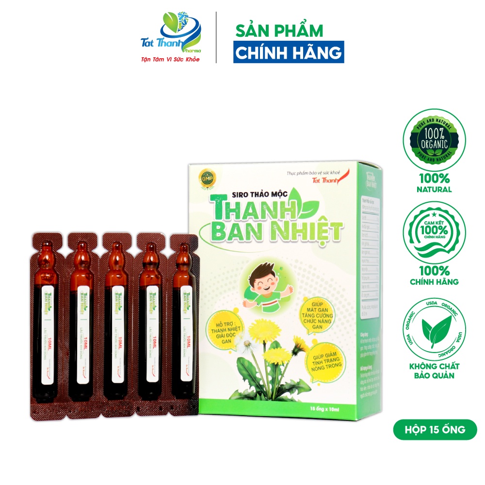 1. THÔNG TIN SẢN PHẨM SIRO THẢO MỘC THANH BAN NHIỆT - Tên sản phẩm: Thực phẩm bảo vệ sức khỏe Siro thảo mộc Thanh Ban NhiệtTất - Thương hiệu: Dược phẩm Tất Thành - Xuất xứ: Việt Nam - Quy cách đóng gói: 15 ống/hộp x 10ml - Ngày sản xuất: Xem trên bao bì sản phẩm - Hạn sử dụng: 36 tháng kể từ ngày sản xuất - Số ĐKSP với Cục An toàn thực phẩm – Bộ Y tế: 6023/2020/ĐKSP - Công ty sản xuất: Chi nhánh Công ty cổ phần dược phẩm SYNTECH - Nhà máy Hải Dương - Địa chỉ: Lô CN3, cụm công nghiệp Ba Hàng, phường Nam Đồng, thành phố Hải Dương, Tỉnh Hải Dương.