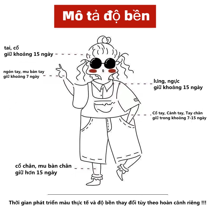 ============ Xin lưu ý ============ 1. Không chà xát hình xăm cho đến khi hình xăm ổn định 2. Không chạm vào hình xăm trong thời gian dài trong vòng 24 giờ sau khi xăm. Có khả năng gây ra nhoè hình. 3. Các cấu tạo cơ thể khác nhau là khác nhau, vì vậy màu sắc của hình xăm bình thường từ đen đến lục lam (hơi xanh lam và xanh lá cây); da ở các bộ phận khác nhau trên cơ thể khác nhau nên thời gian hình xăm cũng khác nhau, thường là 8-20 ngày).