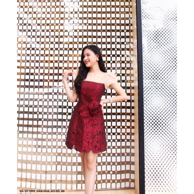 Giới thiệu (Có size) Đầm gấm hoa phối voan đỏ đô kết hoa eo thiết kế cao cấp cho bạn nữ đi tiệc - đi đám cưới