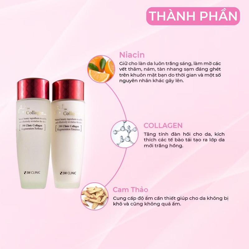 Giới thiệu Bộ Skincare dưỡng da 3W CLINIC Hàn Quốc chiết xuất từ Collagen săn chắc chống lão hóa da & trắng da [Nước hoa hồng+Sữa]