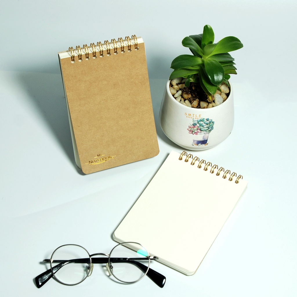 Giới thiệu Sổ tay A6, gáy lò xo, ruột giấy trơn dầy, 140 trang.