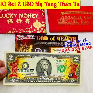 (10 Combo) Tờ 2 Đôla Mỹ Hình Thần Tài Vàng may mắn + bao da đỏ - Quà Tết 2022