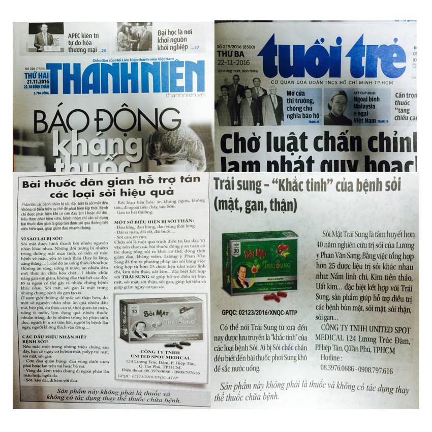 Giấy phép của sản phẩm sản phẩm Sỏi Mật Trái Sung ♦ Sỏi Mật Trái Sung được cấp giấy công bố số XNCB: 14863/2017/ATTP-XNCB, do Cục an toàn thực phẩm- Bộ Y tế Việt Nam cấp ngày 09 tháng 06 năm 2017 ♦ Sản xuất tại: Công ty TNHH Dược phẩm Fusi ♦ Địa chỉ: Cụm công nghiệp Thanh Oai, Xã Bích Hòa, Huyện Thanh Oai, Hà Nội ♦ Phân phối và chịu trách nhiệm về sản phẩm: cty TNHH United Spot Medical Việt Nam