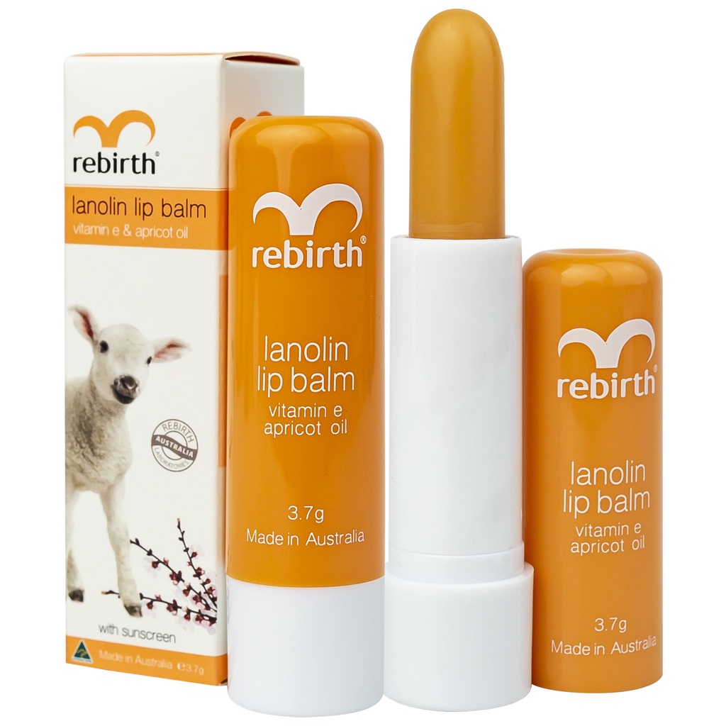 Son dưỡng môi nhau thai cừu Rebirth Lanolin Lip Balm là son dưỡng môi được sản xuất 100% tại Úc, bởi người Úc. Với công thức đặc biệt gồm các thành phần vượt trội như Lanolin, Apricot Oil, Cetyl Alcohol, Mineral Oil,... sản phẩm có tác dụng dưỡng ẩm và làm mềm mịn môi, dưỡng môi hồng hào và tươi tắn. Ngoài ra, còn chứa chất chống nắng, chống tia tử ngoại giúp bảo vệ da môi, phòng ngừa thâm môi. Son không màu và có mùi thơm nhẹ dịu phù hợp dùng để dưỡng môi cho cả nam và nữ.